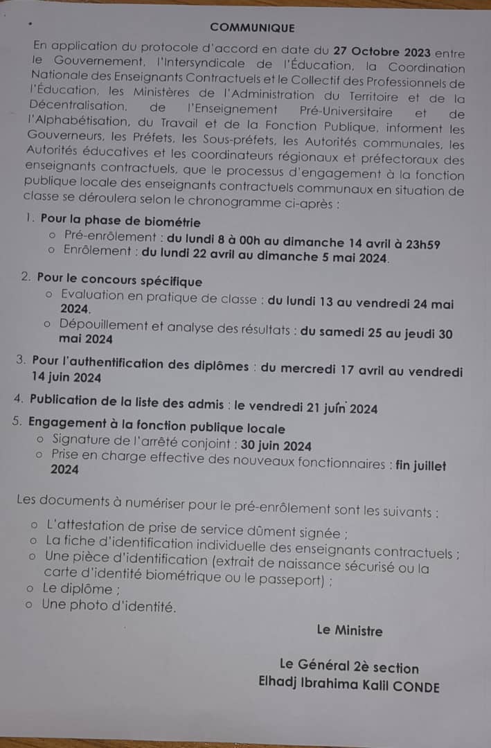 L’annonce officielle du démarrage du processus d’intégration à la fonction publique locale des enseignants contractuels communaux en situation de classe a été faite par le Général 2è section Elhadj Ibrahima Kalil Condé, ministre de l’Administration du territoire. Le communiqué a été lu à la télévision nationale RTG, ce jeudi 4 avril.