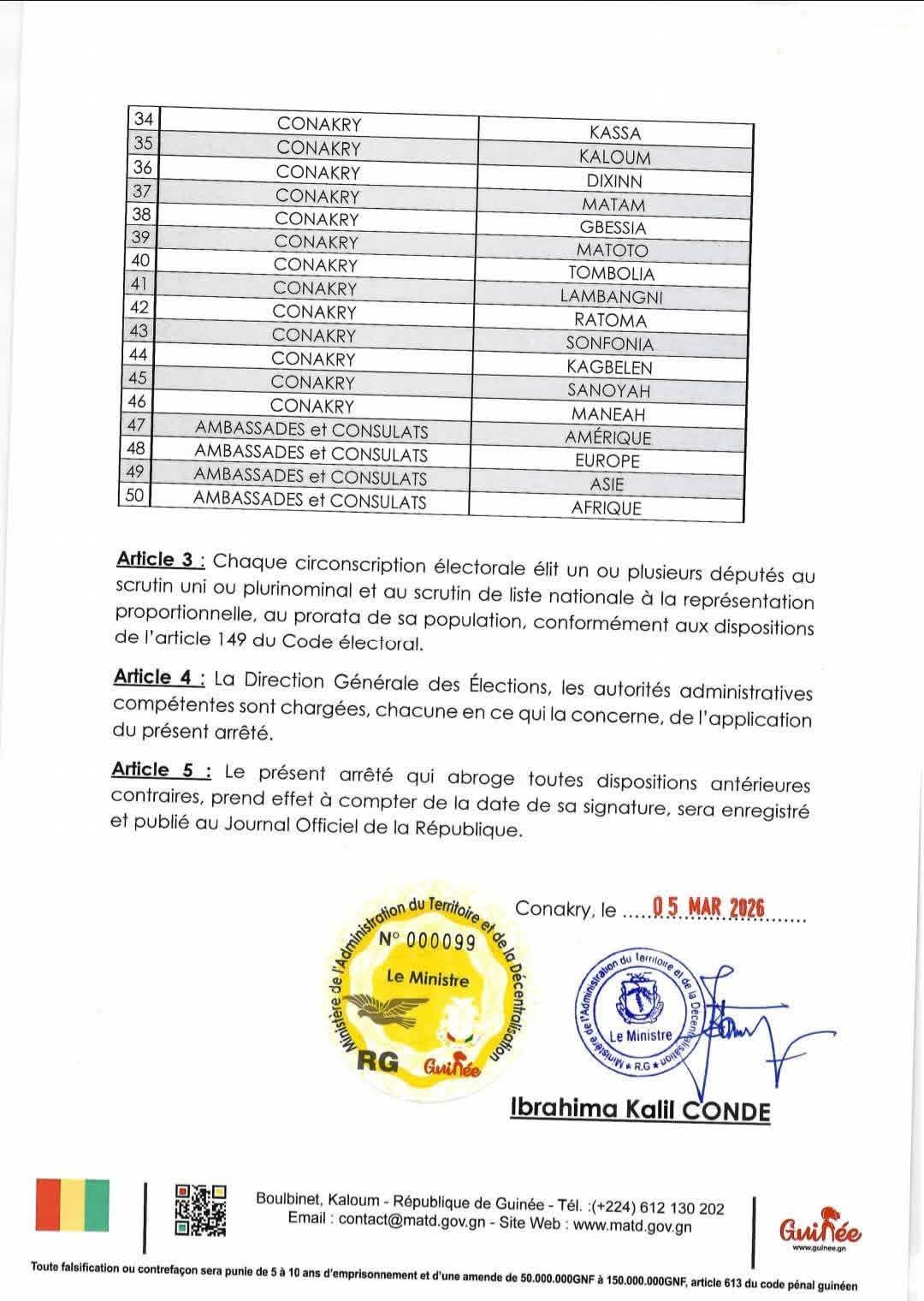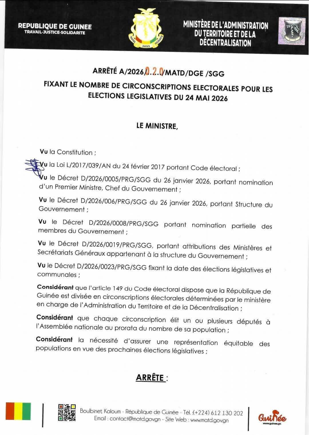 En prélude aux élections législatives prévues le 24 mai 2026, le ministre de l’Administration du territoire et de la Décentralisation (MATD) a pris un arrêté fixant le nombre de circonscriptions électorales en Guinée.