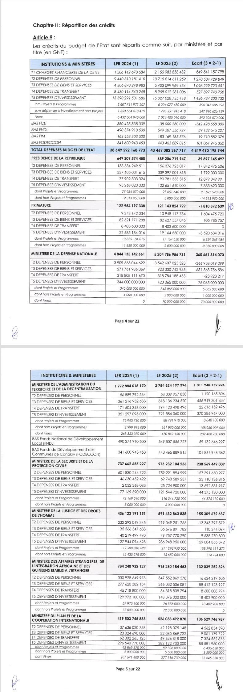 La Loi de finances initiale (LFI) 2025 prévoit un budget global de l’État de 40 703,19 milliards GNF, en hausse par rapport aux 35 073,41 milliards GNF de 2024.