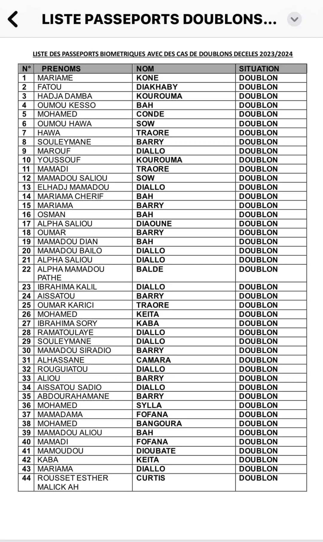 Plus de quatre-vingt dix (90) cas de doublons ont été enregistrés parmi les passeports des Guinéens vivant dans 3 pays européens. Les titulaires de ces documents sont convoqués à partir de lundi 15 avril 2024 à l’ambassade de la Guinée à Bruxelles pour clarifier cette situation.