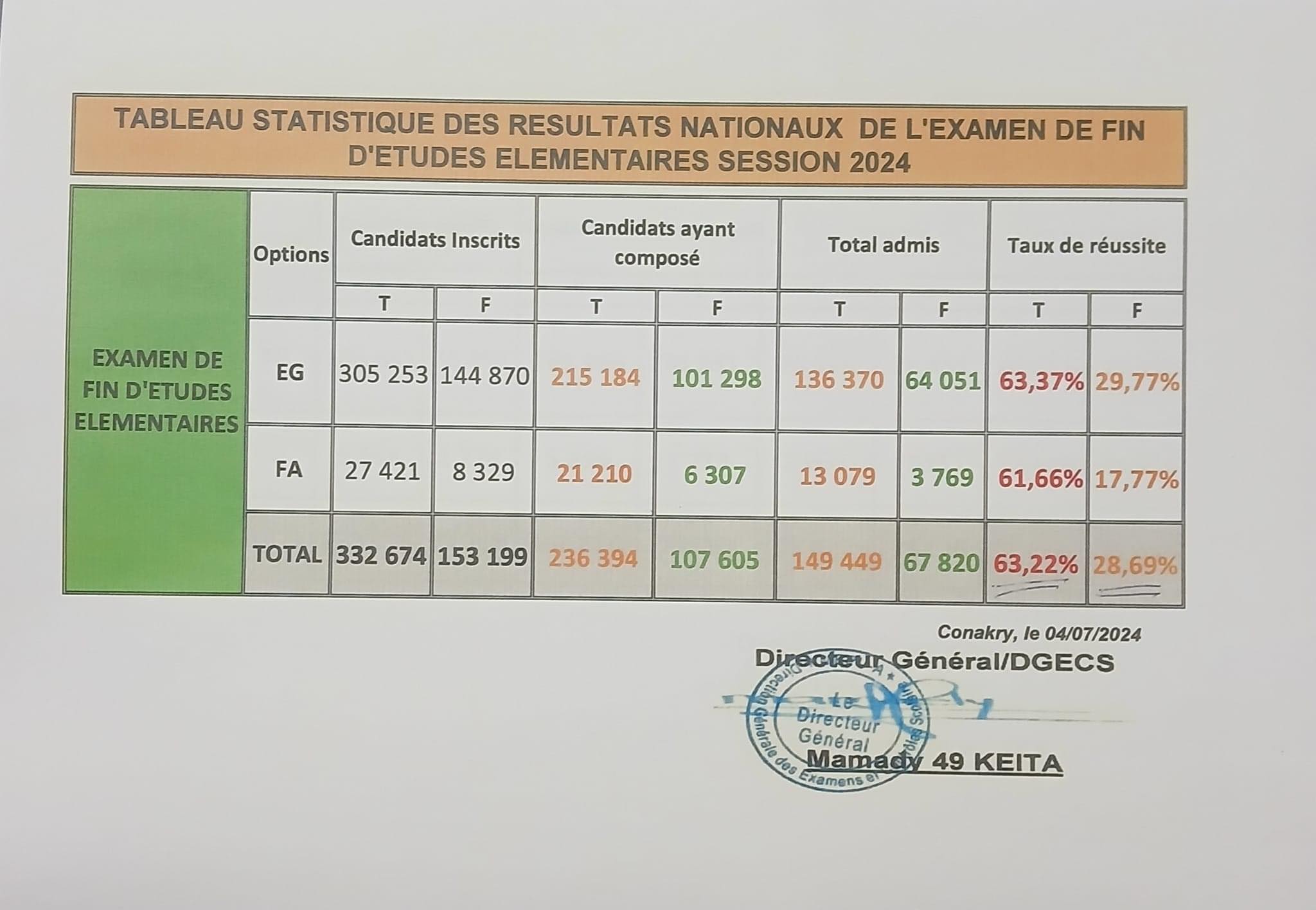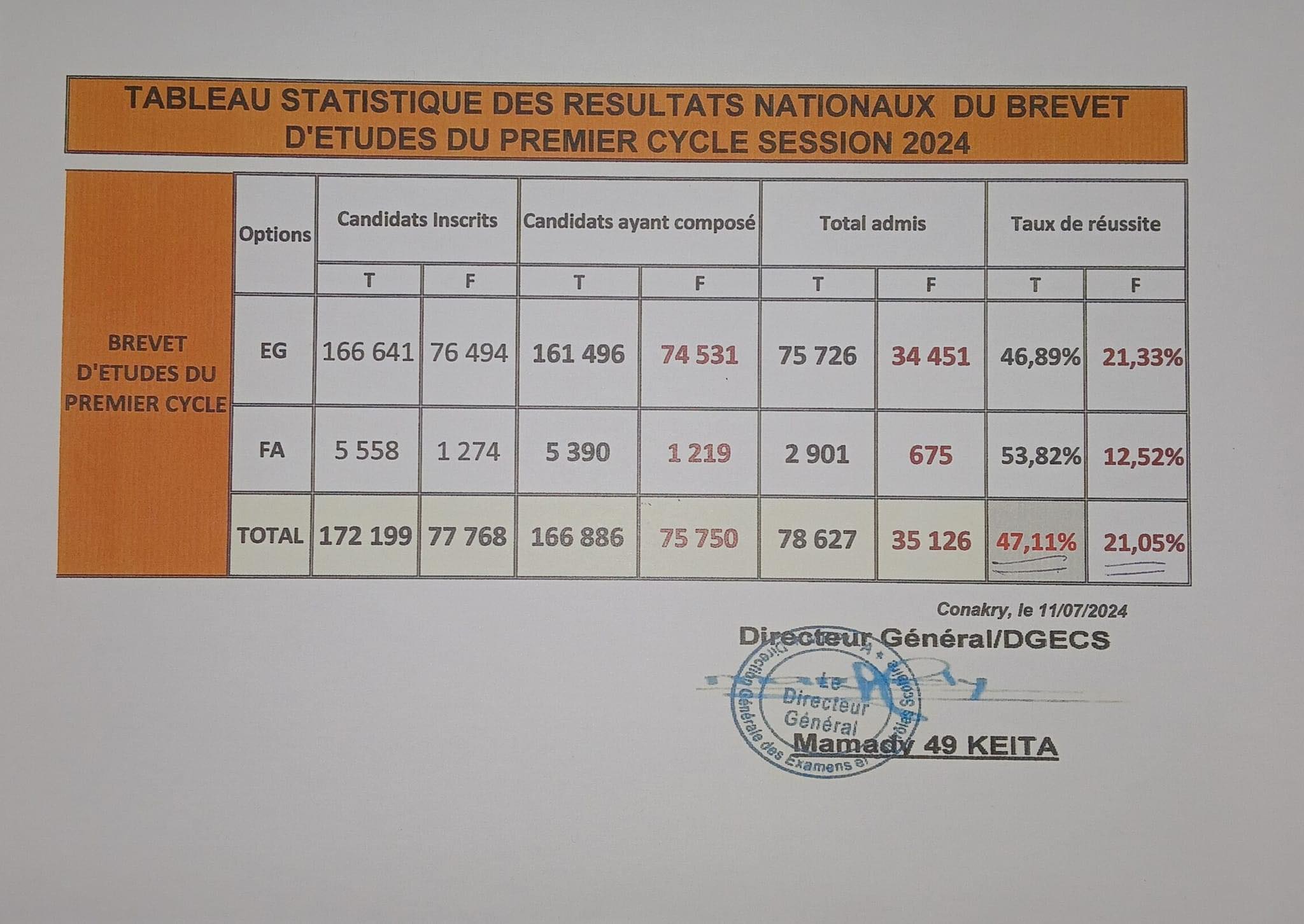 Le ministre de l’Enseignement pré-universitaire et de l’Alphabétisation a rendu public, ce vendredi 12 juillet 2024, les statistiques d’admission à l’examen d’entrée en 7ème année et ceux du BEPC session 2024.