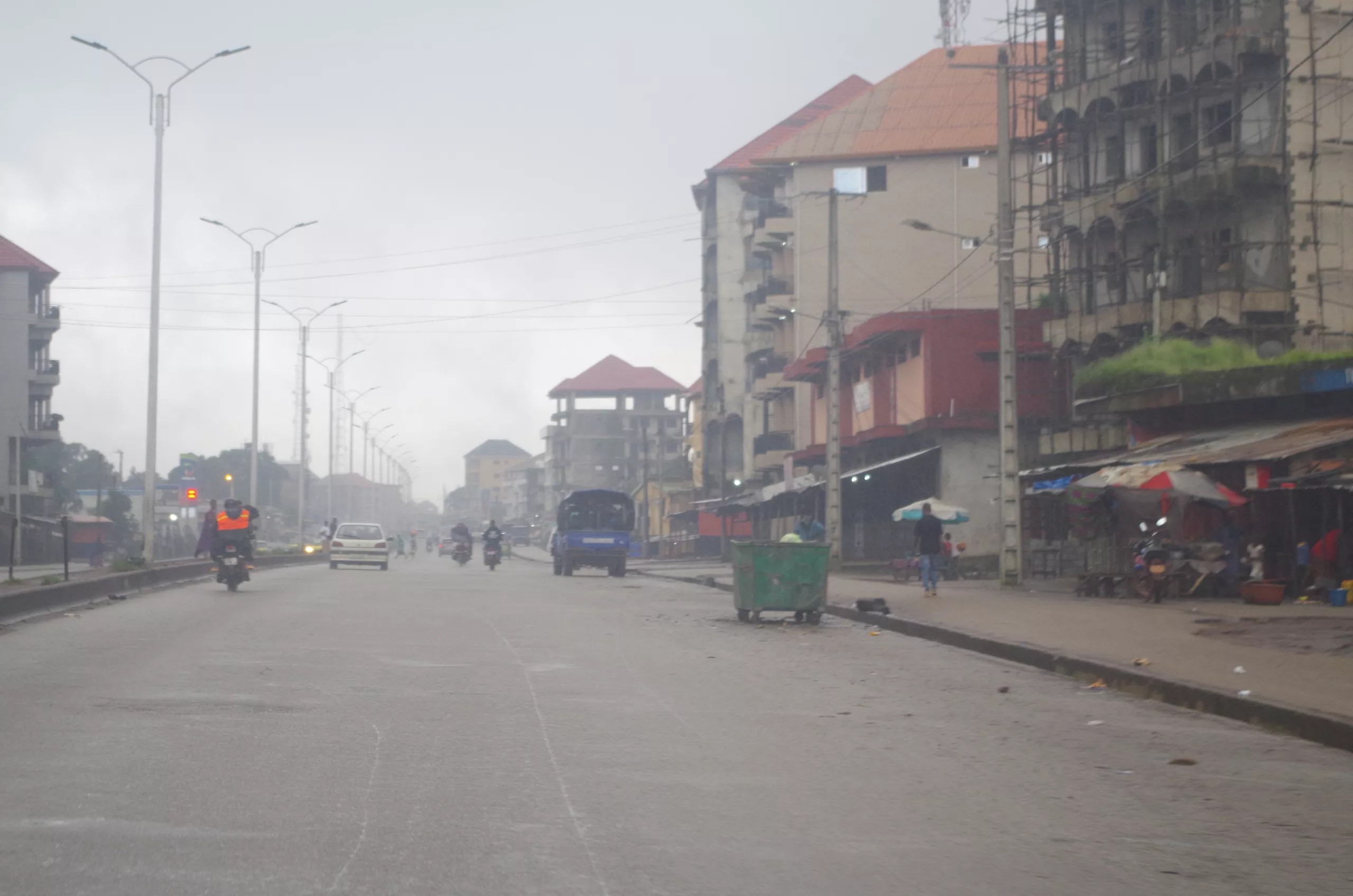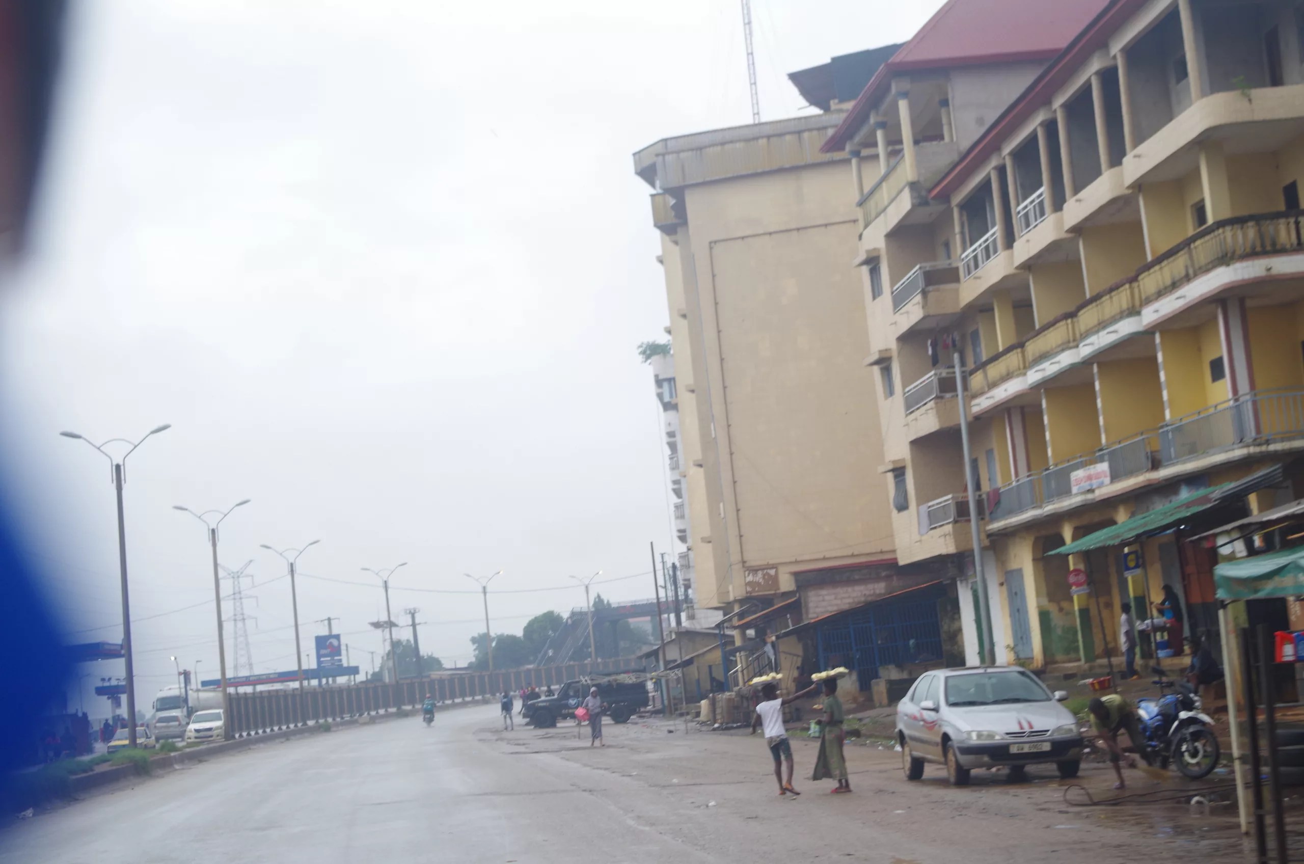 La circulation sur cet axe, d’ordinaire dense et souvent sujette à d’interminables embouteillages, est aujourd’hui étonnamment fluide. Les embouteillages typiques pour atteindre les ronds-points de Cosa et Bambéto sont absents, permettant aux rares véhicules en mouvement de traverser ces points névralgiques à une vitesse inhabituelle. L’atmosphère semble à la fois calme et tendue, comme si la ville retenait son souffle.