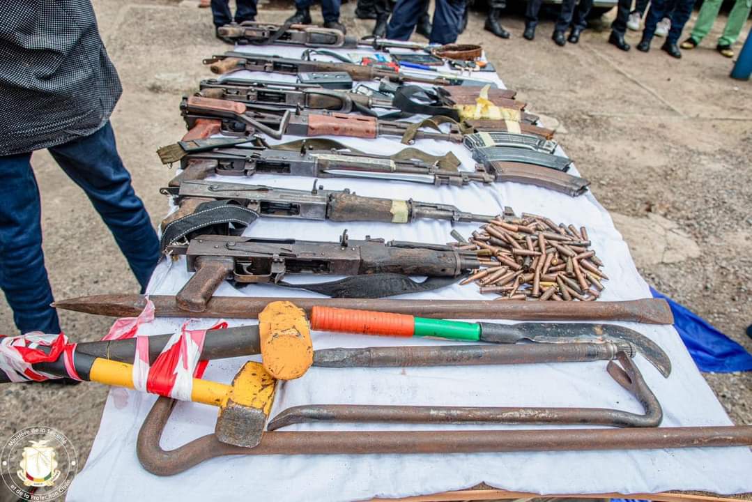 Ils détenaient : « sept (07) armes de guerre de type PMAK ; sept (07) boîtes de chargeurs bien garnies ; deux (02) pieds de biche ; une meule ; trois (03) tournevis ; des marteaux ; et quelques manteaux de corps », rapporte le service de communication et relations publiques du ministère de la Sécurité et de la Protection civile.