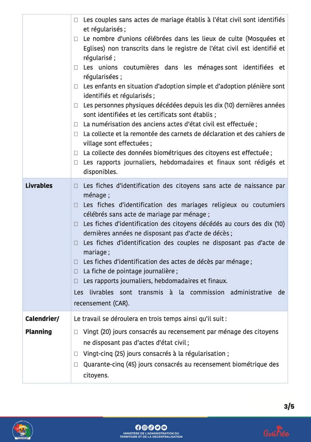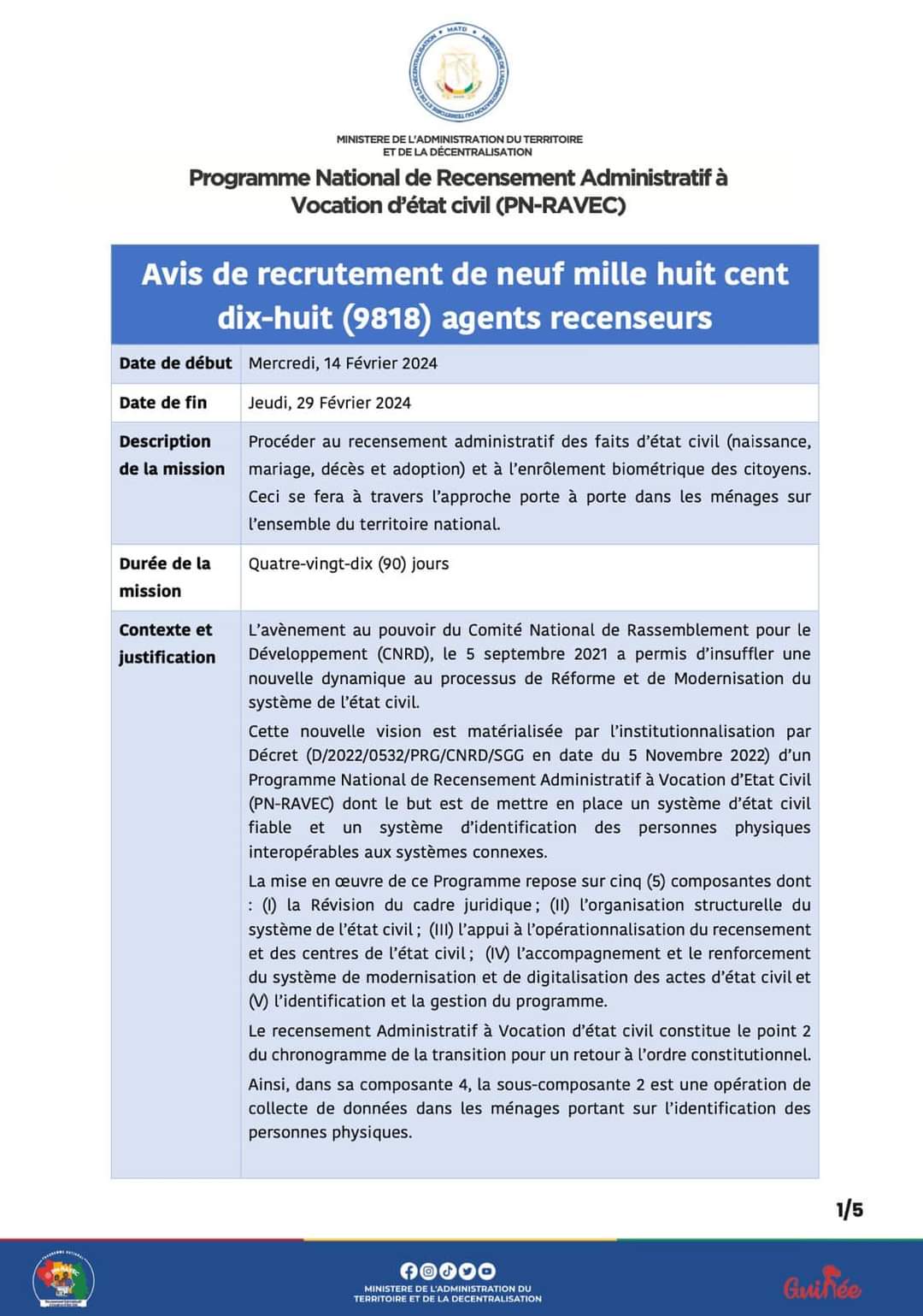 Ce recrutement a lieu du 14 au 29 février sur toute l’étendue du territoire national. La durée de l’opération du récemment administratif à vocation d’état civil (Ravec) est de 3 mois.