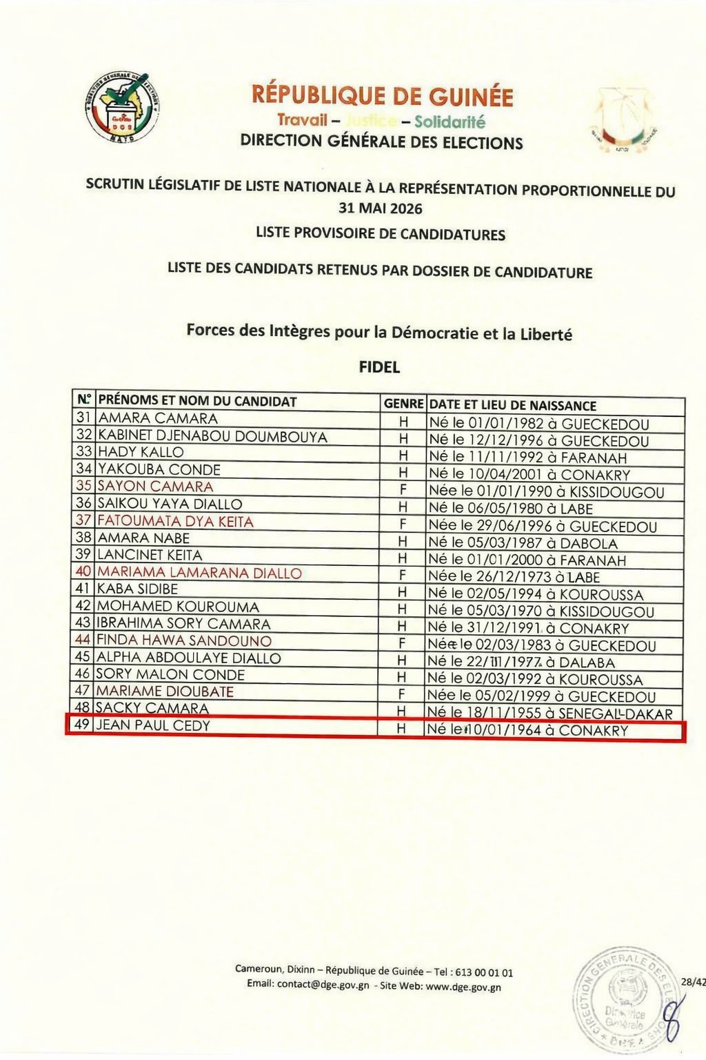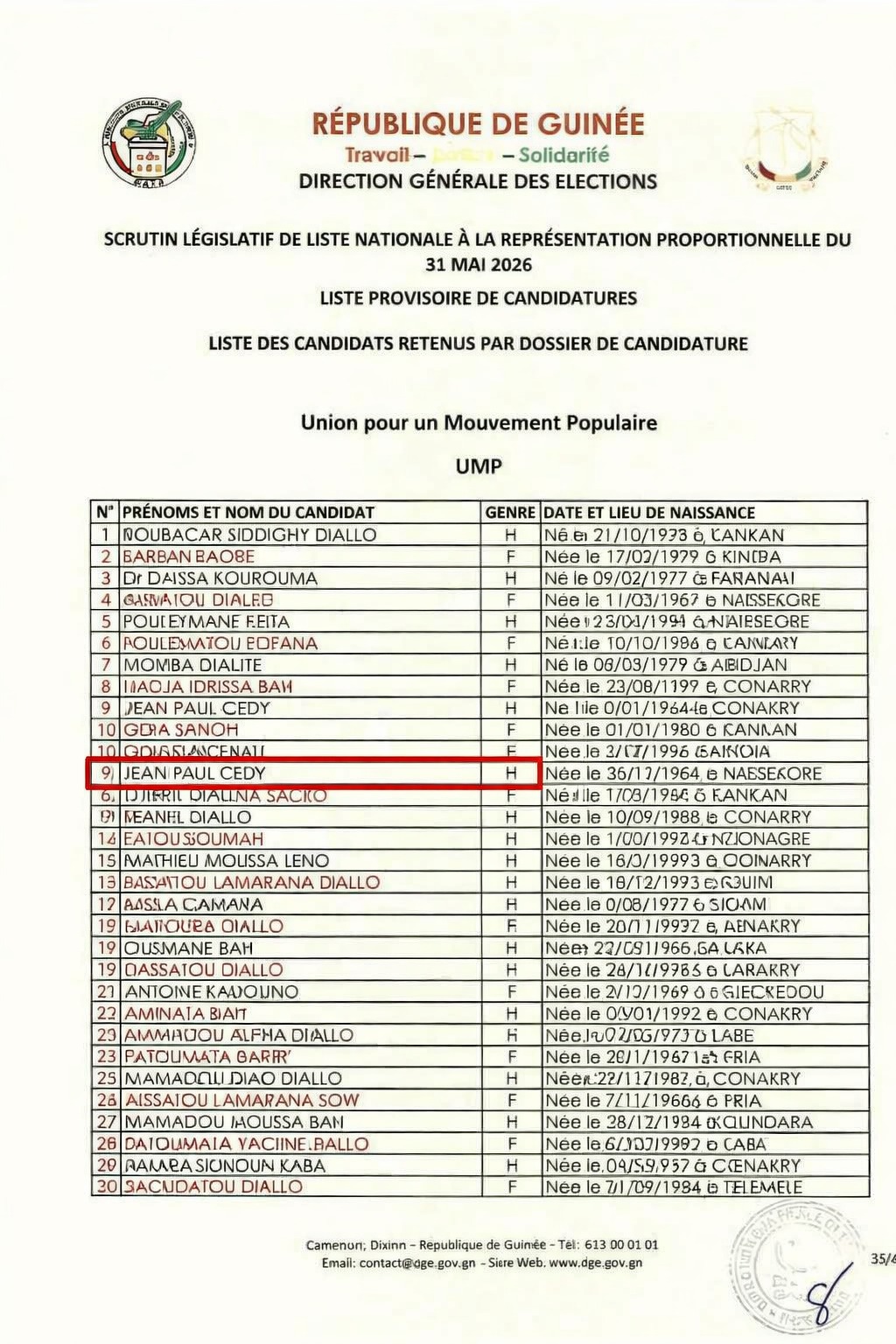 Après vérification, Guinée360 est en mesure de confirmer que Jean Paul Cedy apparaît sur la liste présentée par l’Union pour un mouvement populaire (UMP) où il occupe la neuvième position. Son nom figure également sur la liste du parti FIDEL où il est classé à la 49e place.