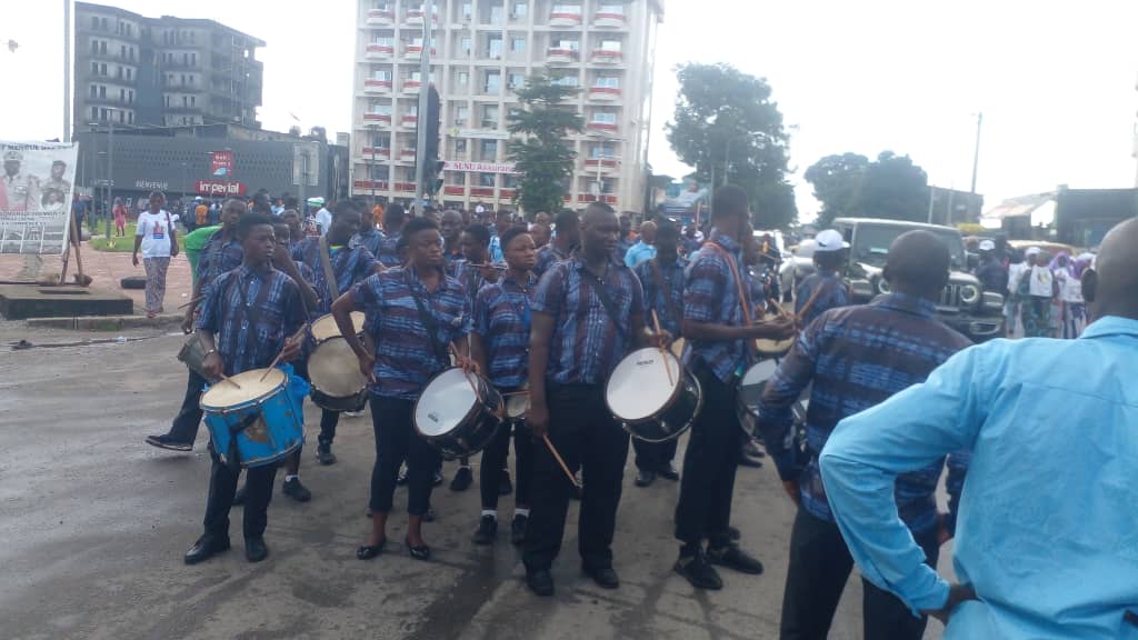 En direction du marché Niger situé à quelques mètres de la présidence, ces manifestants vêtus de tee-shirts blancs, en compagnie de fanfaristes, marchent librement. On peut observer sur leurs uniformes des photos du président de la Transition, le général Mamadi Doumbouya, le slogan “Esprit CNRD” et le branding Guinée.