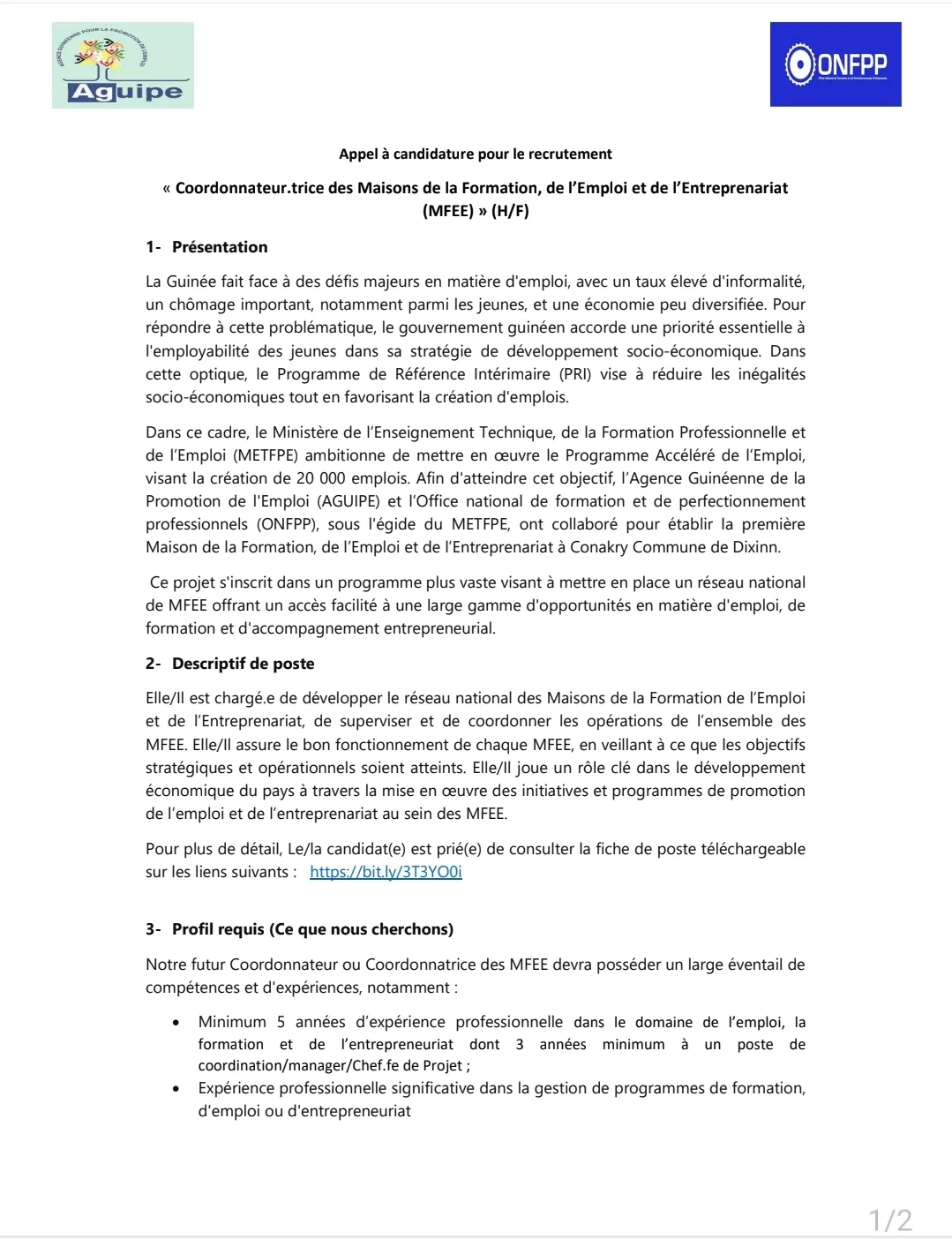 <a href="https://www.guinee360.com/20/02/2024/appel-a-candidature-pour-le-recrutement-coordonnateur-trice-des-maisons-de-la-formation-de-lemploi-et-de-lentreprenariat-mfee/screenshot_20240220_183425_samsung-notes/" rel="attachment wp-att-127597"><img class="size-full wp-image-127597 aligncenter" src="https://www.guinee360.com/wp-content/uploads/2024/02/Screenshot_20240220_183425_Samsung-Notes-jpg.webp" alt="" width="1079" height="1404" /></a> <a href="https://www.guinee360.com/20/02/2024/appel-a-candidature-pour-le-recrutement-coordonnateur-trice-des-maisons-de-la-formation-de-lemploi-et-de-lentreprenariat-mfee/screenshot_20240220_183443_samsung-notes/" rel="attachment wp-att-127598"><img class="size-medium wp-image-127598 aligncenter" src="https://www.guinee360.com/wp-content/uploads/2024/02/Screenshot_20240220_183443_Samsung-Notes-jpg.webp" alt="" width="1079" height="1390" /></a> Télécharger la version <a href="http://[pdf-embedder url="https://www.guinee360.com/wp-content/uploads/2024/02/Appel-a-candidature-AG-MFEE-Vf.pdf" title="Appel à candidature AG MFEE Vf"]">pdf en cliquant ici</a>.