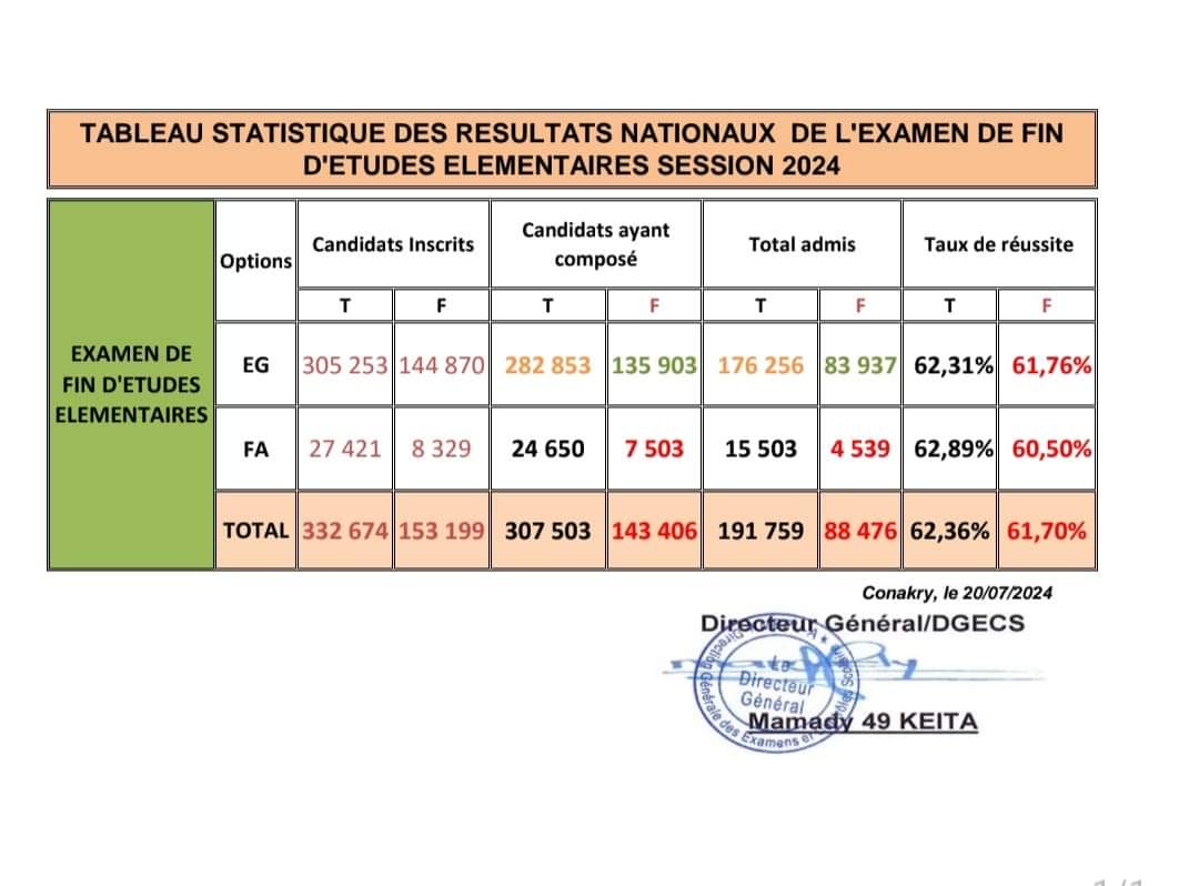 Les résultats publiés le 13 juillet dernier étaient partiels et ne prenaient pas en compte les communes de Kaloum, de Ratoma et de Matoto ainsi que les préfectures de Fria, de Forécariah et de Faranah. Après l’audit des copies et l’intégration des élèves admis de ces zones, le pourcentage d’admission au niveau national a été légèrement revu à la baisse. De 63,22%, le taux d’admission baisse à 62,36%.