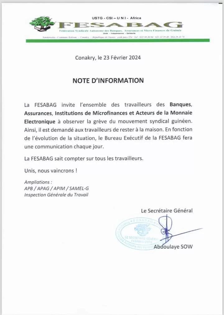 La FESABAG appelle les travailleurs des Banques et Assurances à observer le mot d’ordre, grève générale et illimitée à partir du lundi, 26 février 2024.
