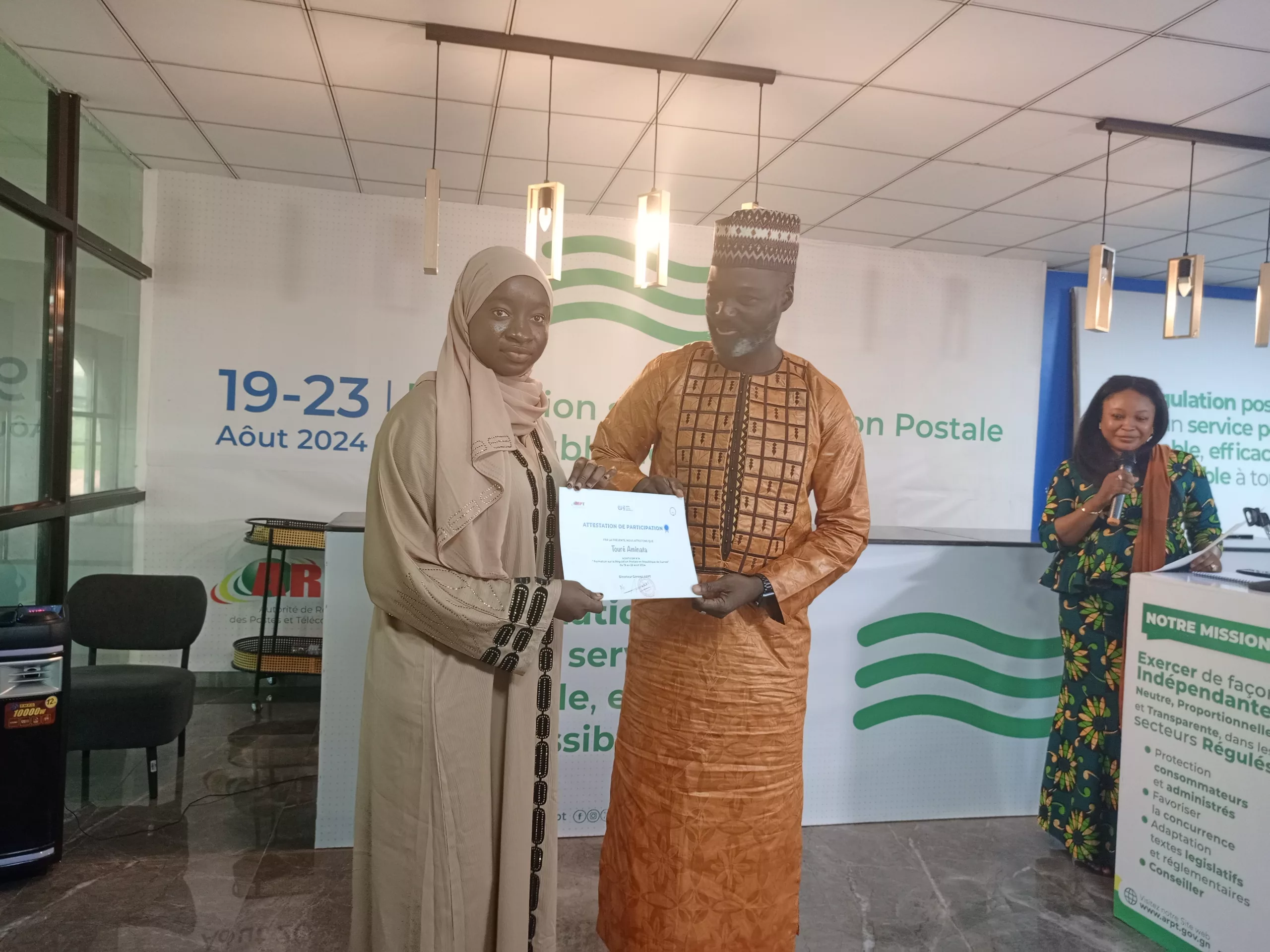 Organisée en partenariat avec l’Union Postale Universelle et le ministère des Postes, de la Télécommunication et de l’Économie Numérique, cette formation s’est tenue à Conakry. Pendant ces cinq jours, les bénéficiaires ont eu l’occasion d’aborder des sujets fondamentaux tels que le cadre réglementaire et légal, la tarification, le financement, la concurrence, la qualité des services postaux, le développement durable, ainsi que la gestion des conflits. Ces thèmes leur ont permis de comprendre l’administration postale et d’être mieux préparés pour le développement des services. C’était une première du genre en République de Guinée.