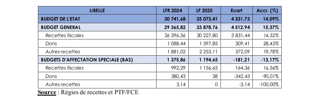 Pour le budget général, les recettes sont projetées à 33 878,76 Mds en 2025 contre 29 365,82 soit un accroissement de 15,37% par rapport à la LFR 2024.