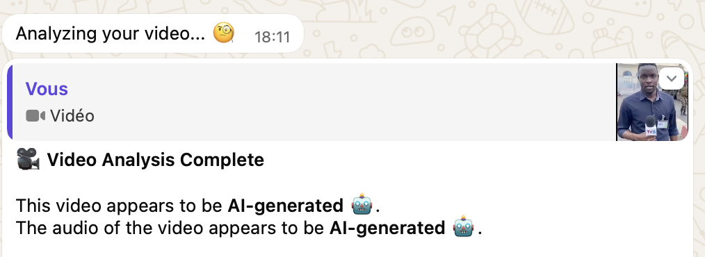 Les mêmes résultats ont été obtenus par l’outil de détection propulsé conjointement par UncovAI et TrustMyContent. Ce dernier intégré à la messagerie WhatsApp permet d’authentifier un contenu depuis votre canapé.