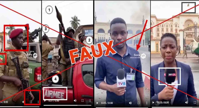 Ce prétendu reportage a été généré par Sora, une intelligence artificielle développée par OpenAI, la maison mère de ChatGPT. Dans la première partie de ce deepfake d’environ 30 secondes présenté comme un élément de reportage, deux journalistes (un homme et une femme) annoncent un prétendu conflit entre des hauts responsables militaires de la transition en Guinée à savoir : le Général Amara Camara porte-parole et secretaire general de la la Presidence, Général Balla Samoura, Haut Commandant de la Gendarmerie nationale et le General à la retraite et ministre de la Defense nationale, Aboubacar Sidiki Camara alias « Idi Amin».