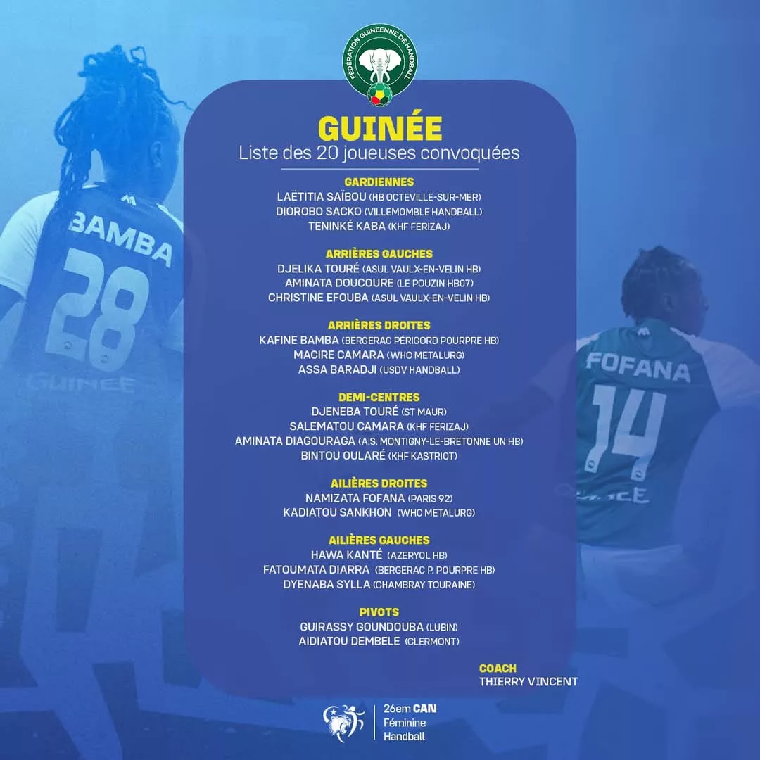 Pour cette 26ème édition de la CAN des Dames, le sélectionneur de l’équipe nationale féminine de Guinée, Thierry Vincent a convoqué 20 joueuses pour représenter le tricolore guinéen dans cette grande mèche du Handball féminin du continent.