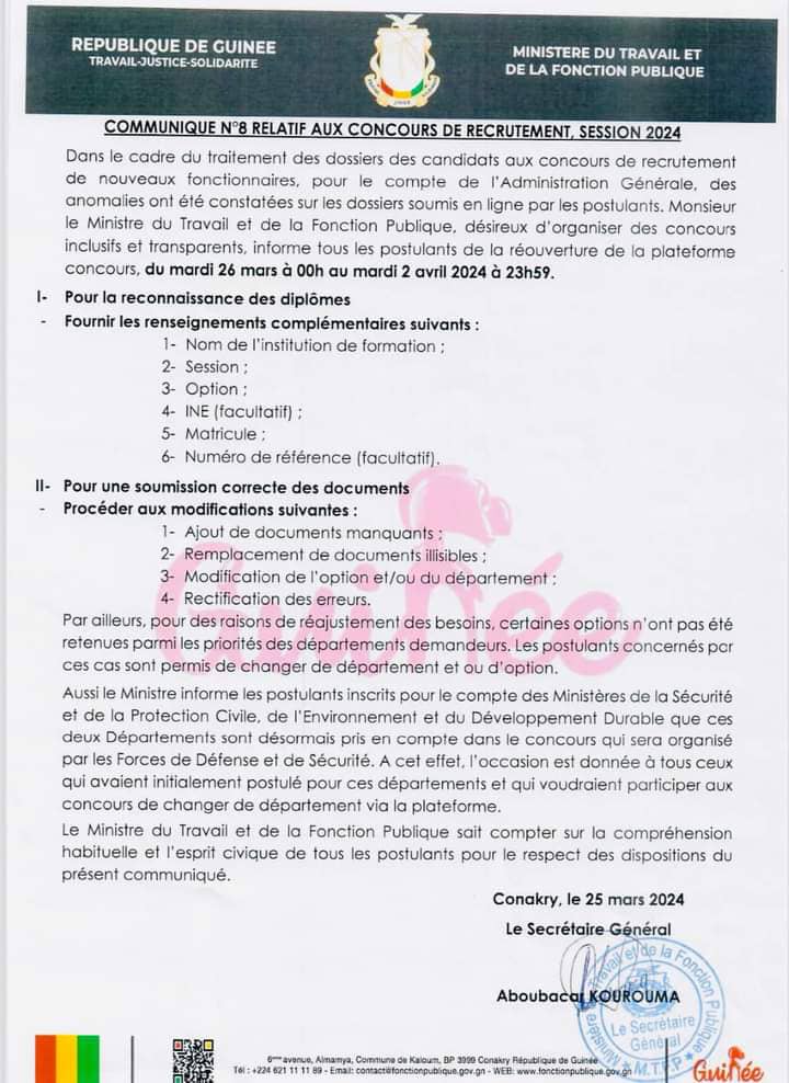 Le ministère du Travail et de la Fonction publique porte à la connaissance des candidats pour le recrutement des nouveaux fonctionnaires de la réouverture de la plateforme dédiée à cet effet.