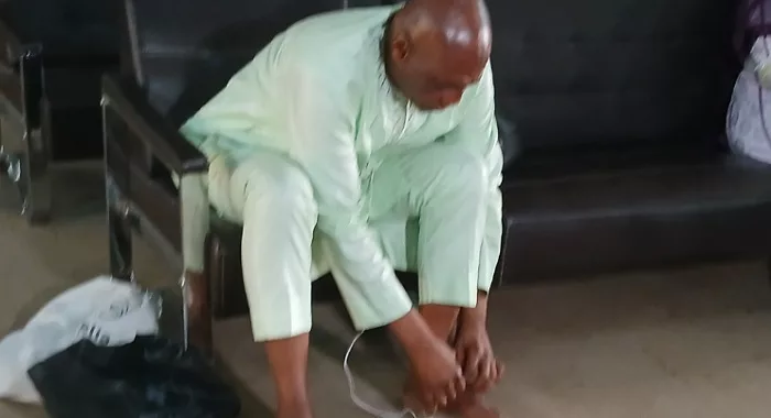 “Depuis 15 mois je suis malade et hospitalisé. Cet appareil que vous voyez avec moi. Je suis obligé de le mettre sur mon pied au moins 5 minutes toutes les 3 heures pour ne pas prendre le risque de me blesser parce que je ne sens plus rien. J’avoue que ça allait mieux en décembre 2023. Mais depuis deux semaines, ça a repris de manière inquiétante et les médecins me disent : si je continue à me stresser, je risque de perdre mes orteils au mieux. Ils (les médecins) appellent cela la neuropathie périphérique.