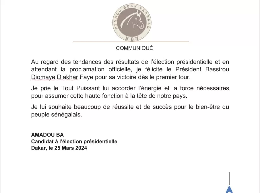 Le Premier ministre, Amadou Ba, candidat de la mouvance présidentielle, a concédé sa défaite et félicité le vainqueur.
