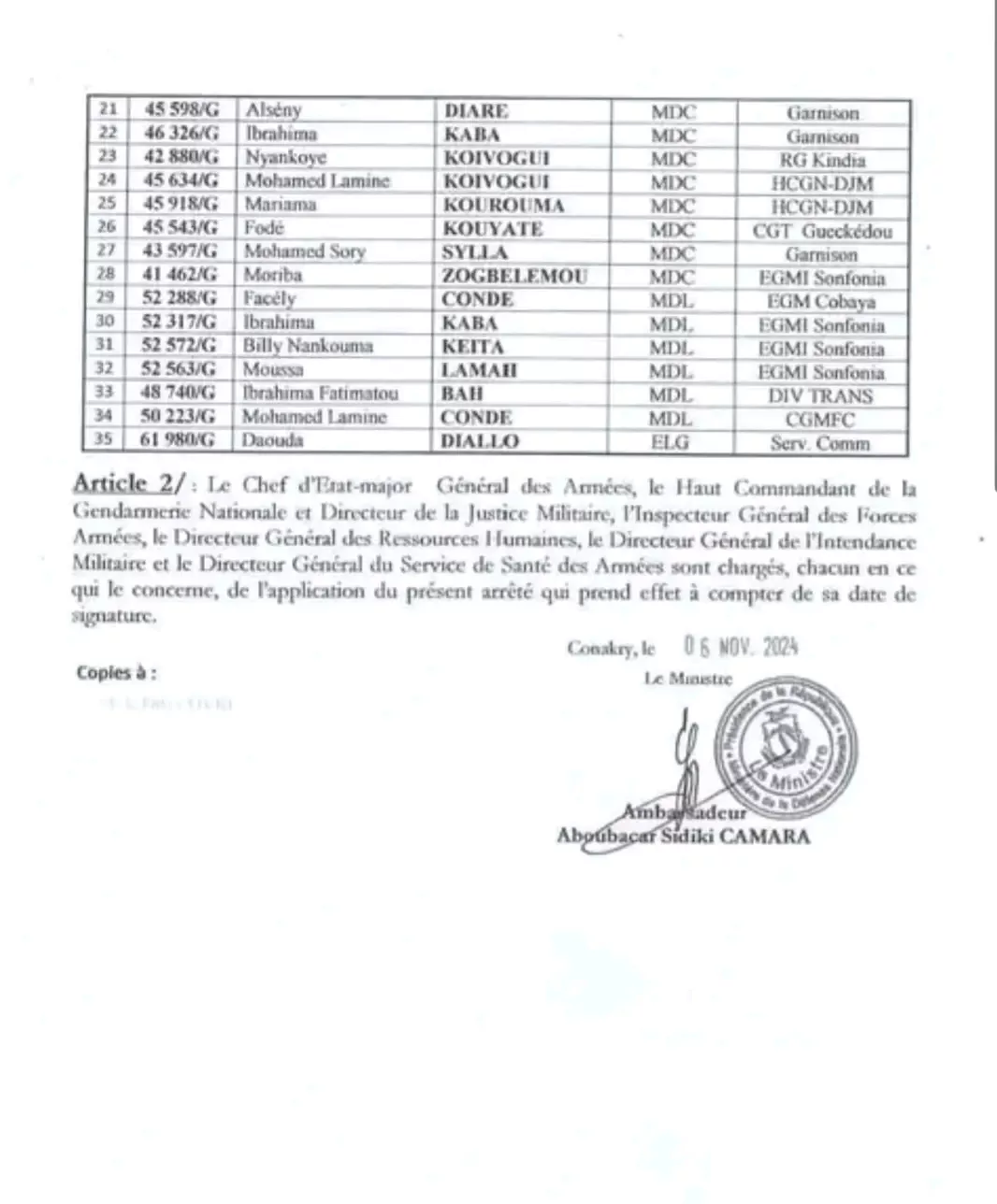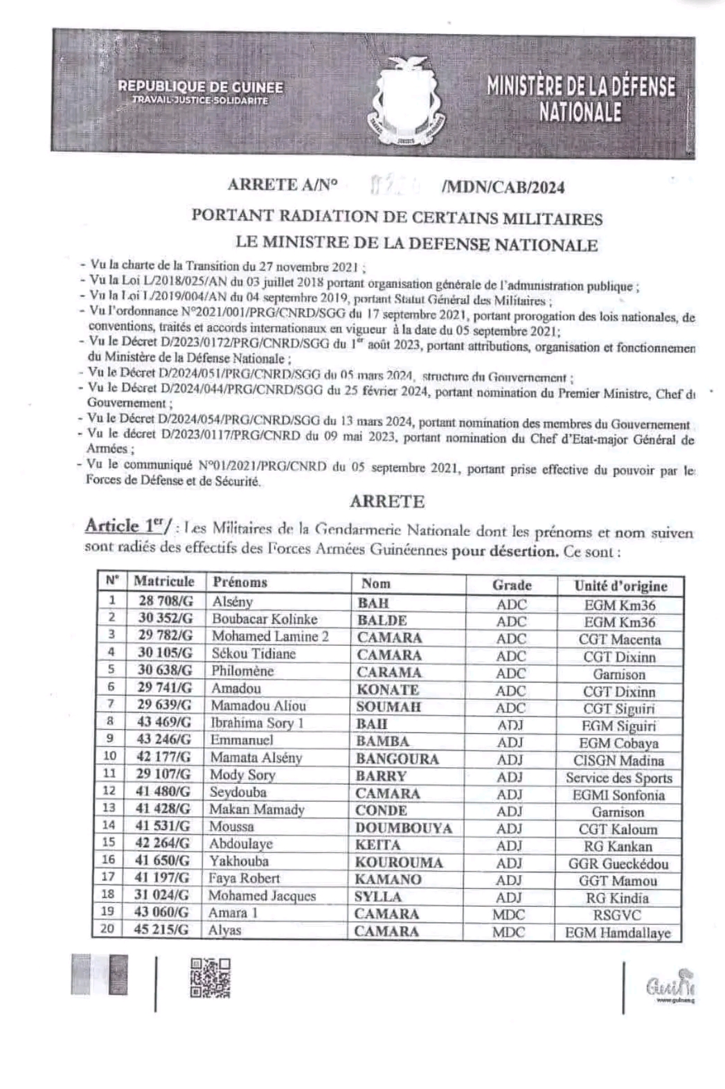 Dans un arrêté signé par le ministre de la Défense, Aboubacar Sidiki Camara, 35 gendarmes ont été radiés des effectifs des forces armées guinéennes pour “désertion”.