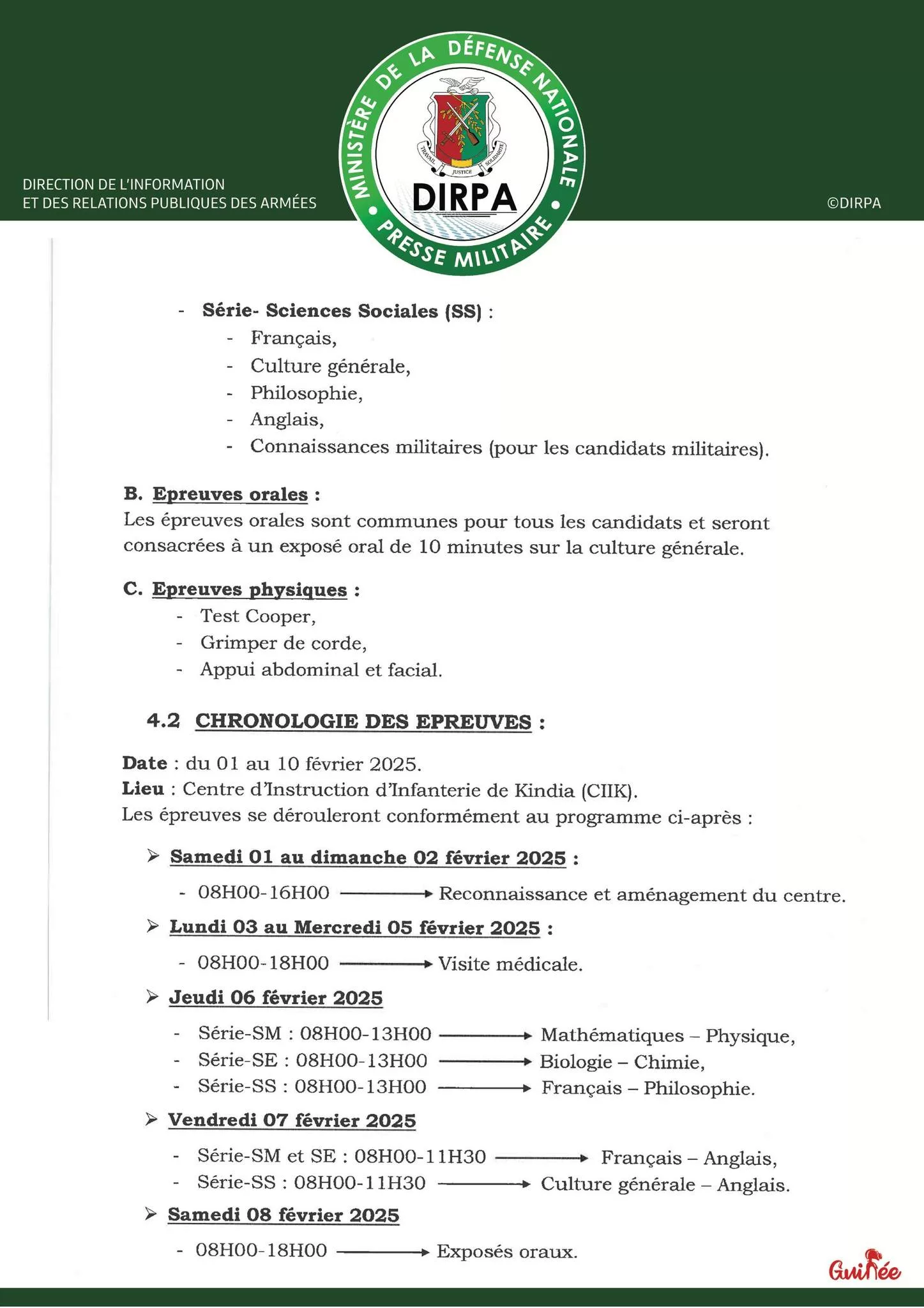 Le concours d’admission aux écoles de formation initiale d’officiers (étrangères et EMIA-Guinée), session 2025, sera organisé par la Direction des Organismes de Formation Interarmées (DOFI) du samedi 1er au lundi 10 février 2025 au Centre d’Instruction d’Infanterie de Kindia (CII-Kindia).