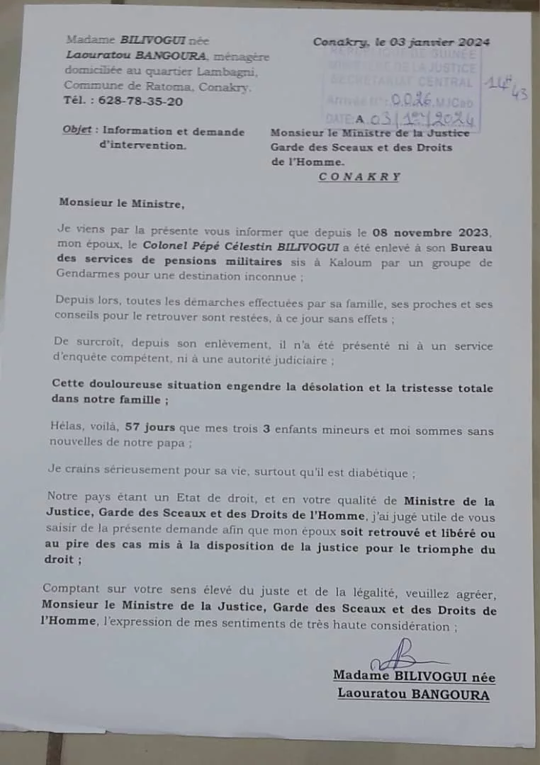 À travers une lettre adressée au ministre de la Justice, Mme Laouratou Bangoura explique que son mari a été enlevé au service de pensions militaires, le 8 novembre dernier 2023. Et depuis lors, son mari n’a pas été présenté devant une juridiction du pays. Elle s’inquiète que son époux reste introuvable.