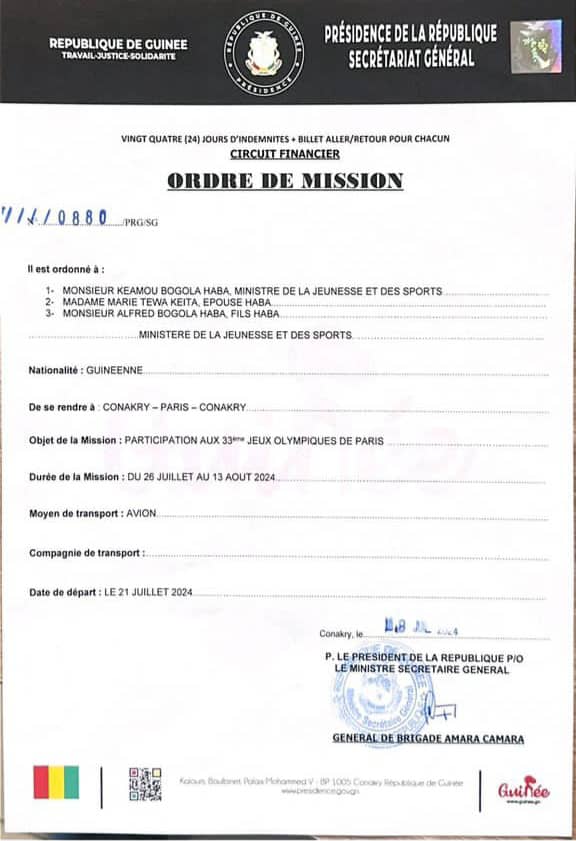 Les Jeux Olympiques, censés être le summum de la compétition et de l’intégrité, risquent fort de devenir le décor d’un scandale politico-financier de premier ordre pour la Guinée. Il semble que le seul sport pratiqué par la délégation guinéenne soit l’art de la demande de visa. ci-dessous l’ordre de mission du ministre Bogola Haba et sa famille.