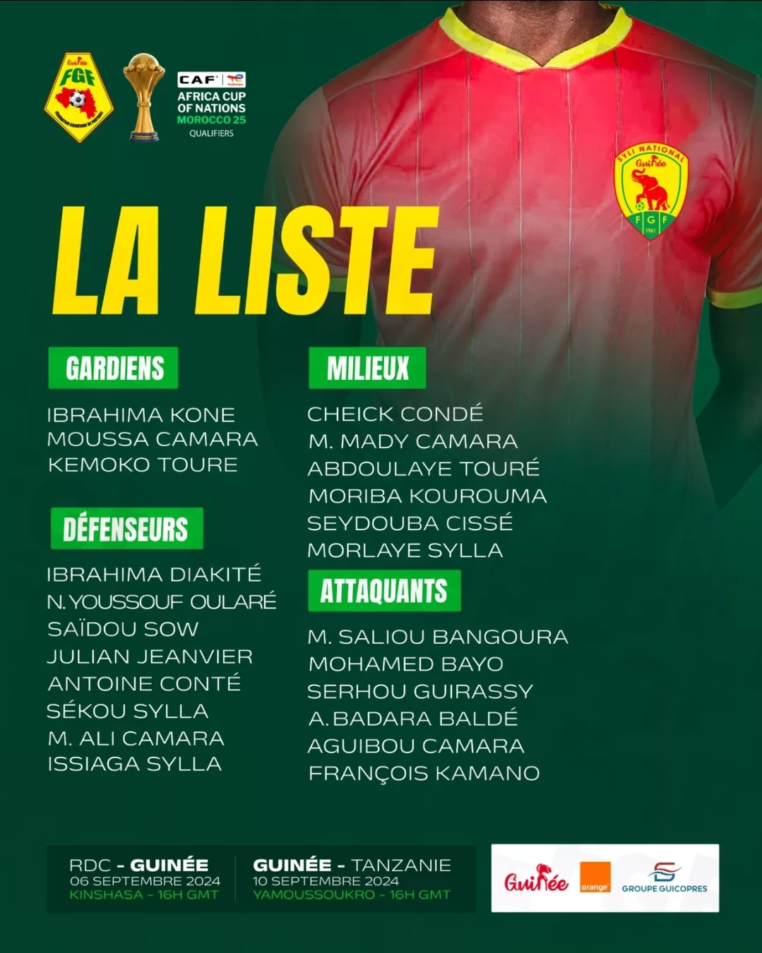 La Guinée affronte la RD Congo (6 septembre 2024 à Kinshassa) et la Tanzanie (10 septembre 2024 à Yamoussoukro). Dans son programme de préparation, elle sera en regroupement à Abidjan à partir du 31 août 2024 avant de s’envoler le 04 septembre 2024 pour la RD Congo. L’équipe nationale va ensuite revenir à Abidjan dès le 7 septembre avant de rejoindre Yamoussoukro dans la matinée du 9 septembre 2024 pour recevoir la Tanzanie le lendemain.