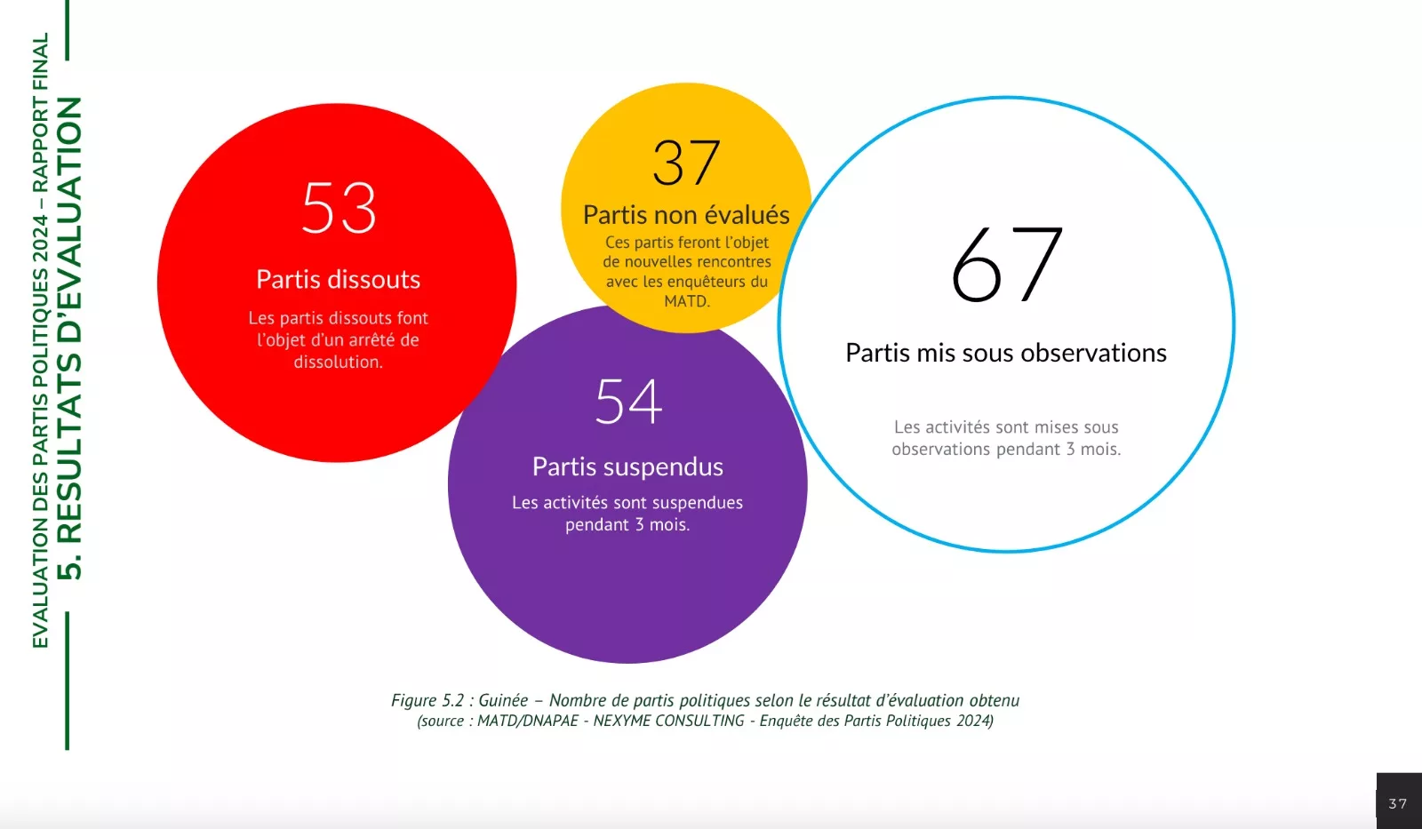 Le rapport recense un total de 211 partis sur l’ensemble du territoire. Parmi les partis suspendus, on retrouve le Parti de l’Unité et du Progrès (PUP) de feu Lansana Conté, le PDG-RDA de feu Ahmed Sékou Touré, Génération Citoyenne (GeCi), la Nouvelle Génération pour la République (NGR), et le Parti du Travail et de la Solidarité (PTS), entre autres.