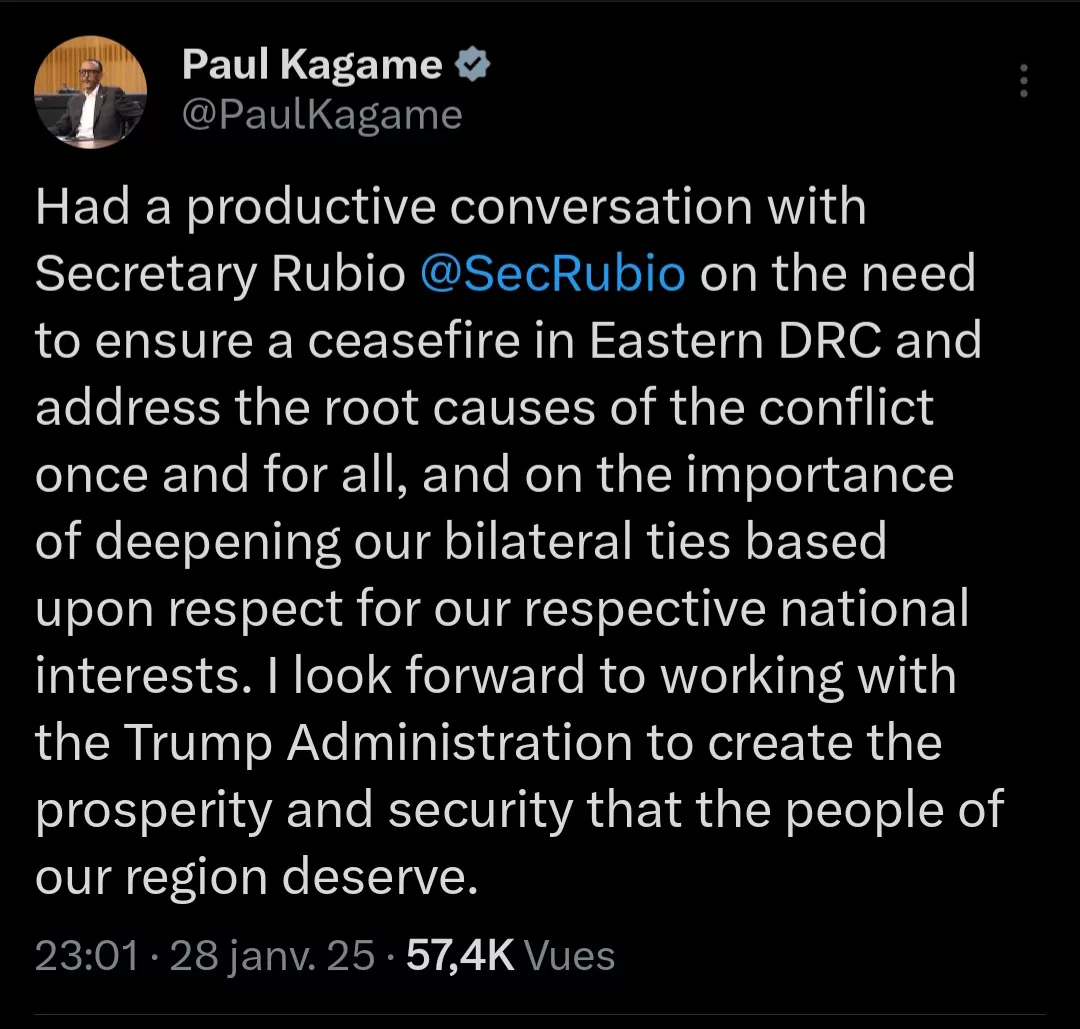 J’ai eu une conversation productive avec le secrétaire Rubio @SecRubio sur la nécessité d’assurer un cessez-le-feu dans l’est de la RDC et de s’attaquer aux causes profondes du conflit une fois pour toutes, et sur l’importance d’approfondir nos liens bilatéraux sur la base du respect de nos intérêts nationaux respectifs. Je me réjouis de travailler avec l’administration Trump pour créer la prospérité et la sécurité que les populations de notre région méritent”, a écrit Kagamé sur X.