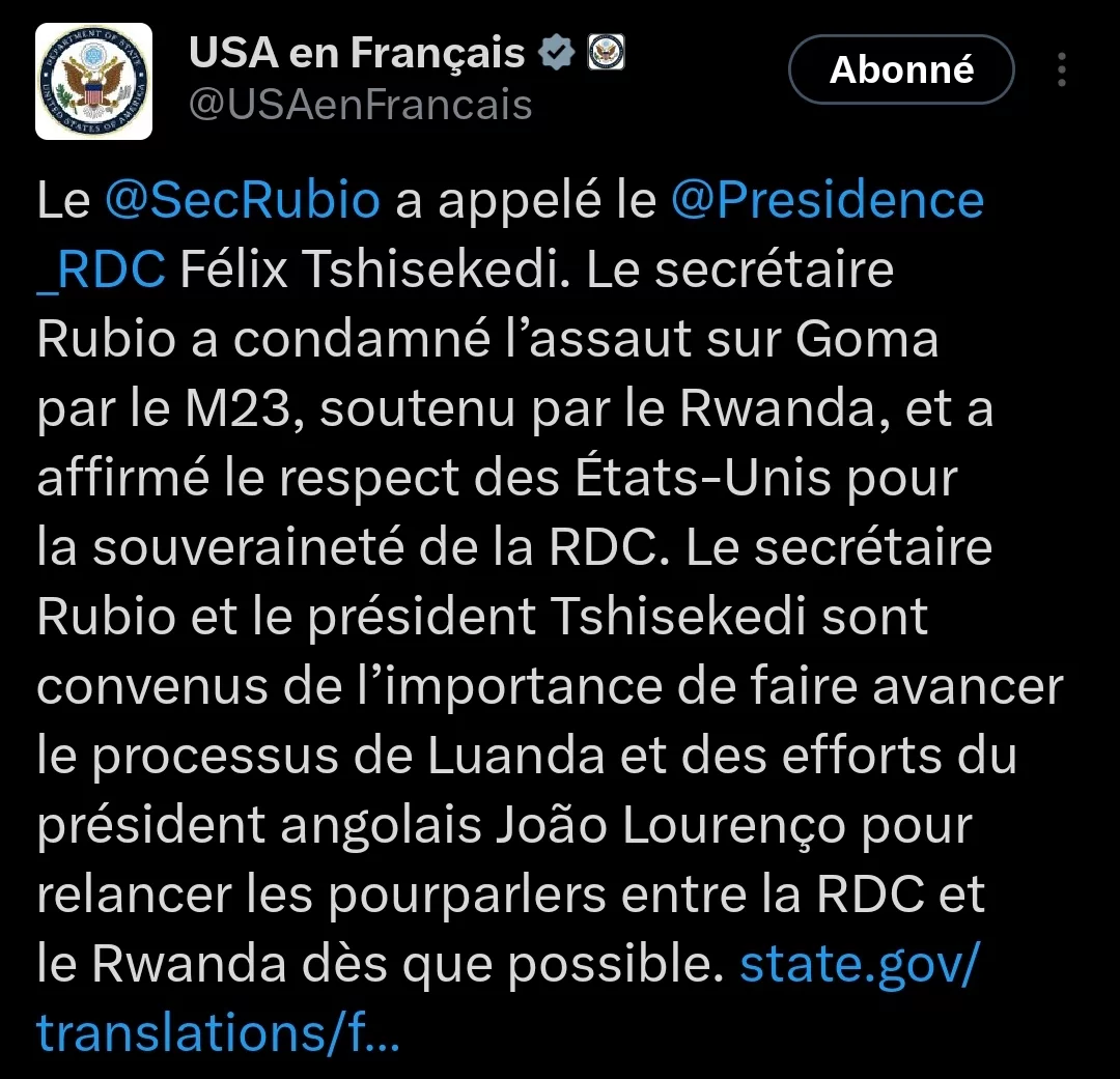 Rubio a condamné l’assaut sur Goma par le M23, soutenu par le Rwanda, et a affirmé le respect des États-Unis pour la souveraineté de la RDC. Le secrétaire Rubio et le président Tshisekedi sont convenus de l’importance de faire avancer le processus de Luanda et des efforts du président angolais João Lourenço pour relancer les pourparlers entre la RDC et le Rwanda dès que possible”, a publié sur X le département d’État.