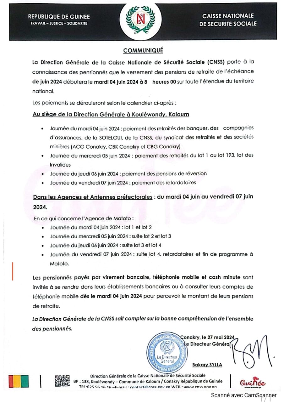 La Direction Générale de la Caisse Nationale de Sécurité Sociale (CNSS) porte à la connaissance des pensionnés que le versement des pensions de retraite de l’échéance de juin 2024 débutera le mardi 04 juin 2024 à 8 heures 00 sur toute l’étendue du territoire national.