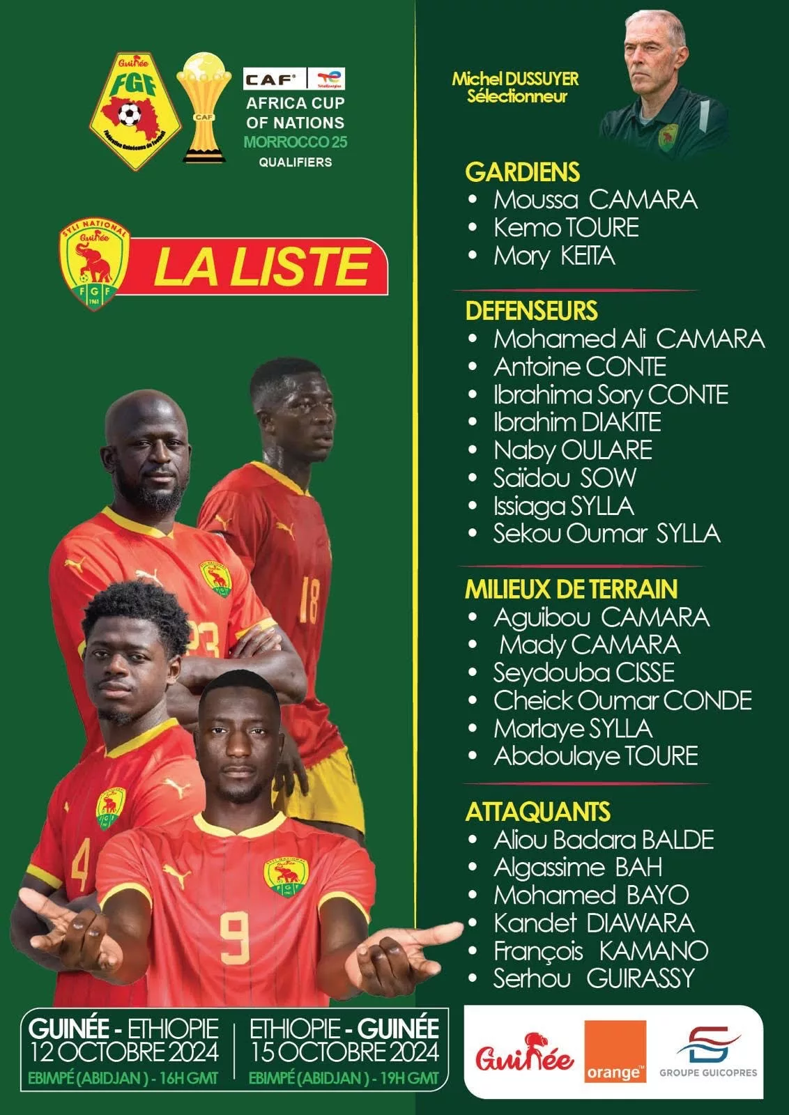 Les 12 et 15 octobre 2024 à Abidjan, la Guinée affronte l’Éthiopie. Ces rencontres s’inscrivent dans le cadre des éliminatoires de la prochaine Coupe d’Afrique des Nations.