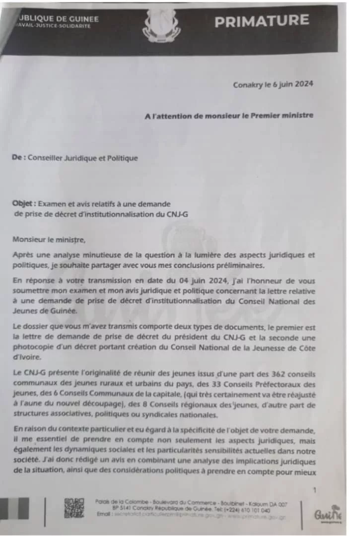 Dans un courrier daté du 4 juin 2024 et adressé au Premier ministre, le CNJ-G a sollicité des mesures visant à institutionnaliser l’organisation et à renforcer sa légitimité. En réponse, le conseiller juridique et politique de la Primature, après avoir examiné le dossier, a souligné l’importance de garantir un cadre juridique stable pour le CNJ. Il a également recommandé la mise en place de mécanismes d’évaluation et d’adaptation réguliers, afin de permettre au Conseil d’évoluer en fonction des besoins de la jeunesse guinéenne.