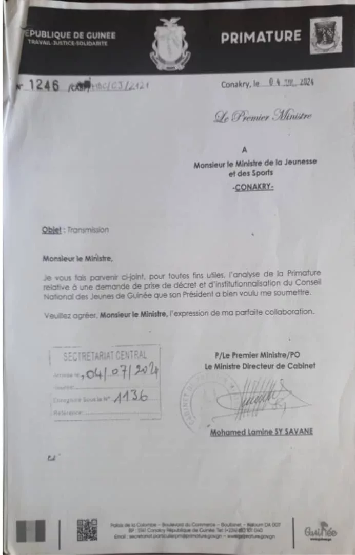 Le 4 juillet 2024, le Premier ministre a saisi le ministre de la Jeunesse pour lui transmettre son analyse concernant la demande de décret d’institutionnalisation du CNJ-G formulée par son président. Cependant, selon nos informations, ce dossier reste jusqu’à présent sans réponse et semble être laissé dans les tiroirs du ministre Kéamou Bogola Haba, qui tarde à mettre en application cette décision.