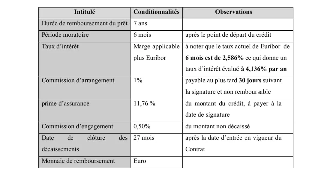 Les conditionnalités de la mise à disposition de ce prêt sont résumées dans le tableau ci-dessous : (voire tableau)